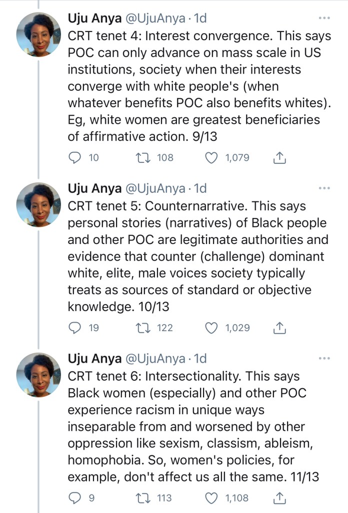 Dr. Uju Anya lays out in clear language an overview of CRT in a Twitter thread that she posted, and which I’ve included images of at the bottom. I am using her definitions from said thread as a basis for this, and unpacking them a bit more in the context of bridge building. If your bridge building conversations are being derailed by accusations of CRT, this thread may be a useful place to begin dialogue.