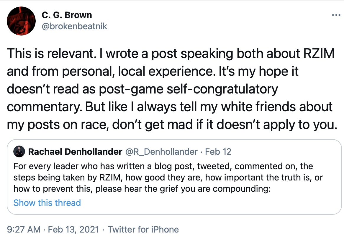 Rachael Denhollander, a well-known survivor who also works with organizations to root out abuse culture, and who is in fact working with RZIM, had this to say about the many thinkpieces being produced: